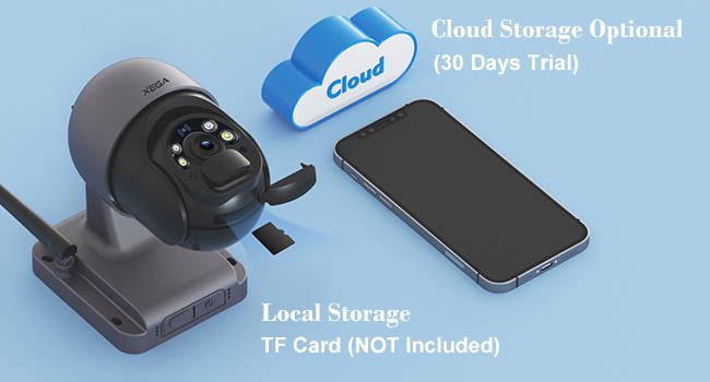 - Supports SD card (Max 128G) and cloud storage (30-day trial included).