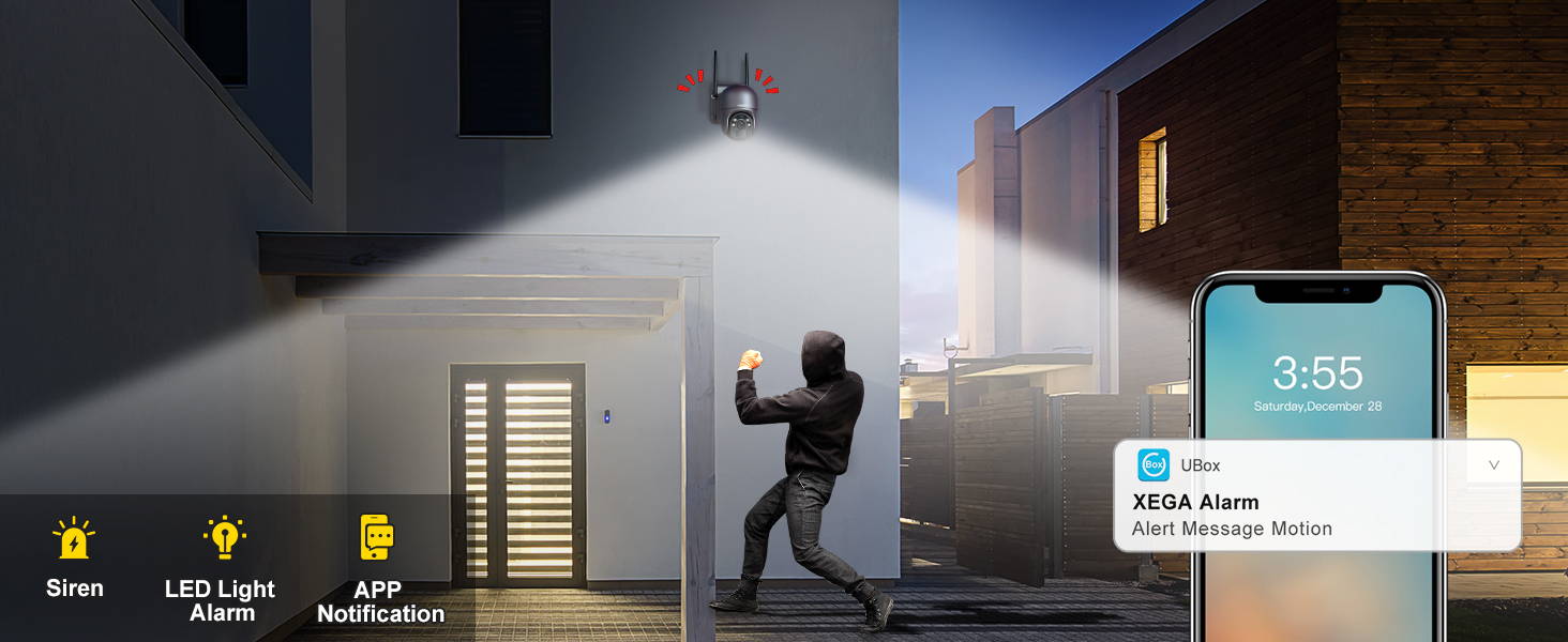 This camera isn’t just for recording—it’s for active defense. In siren mode, motion detection triggers an immediate response: a piercing siren and bright LED spotlight activate to deter trespassers, while an instant APP notification lets you check the situation in real time. Whether you’re at home or away, you’ll always be alerted, and your space stays protected.